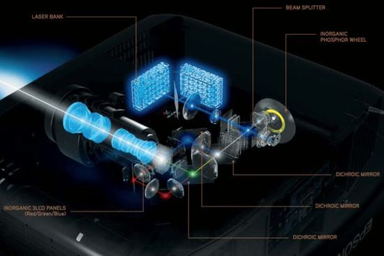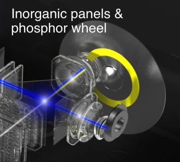 As known, the company uses a blue laser diode array and a disk with yellow phosphor to generate white, which is then converted using optics to red, blue and green and sends to three .74-inch LCD chips.