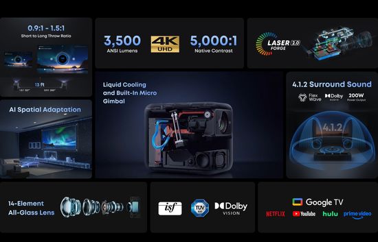 – Anker Nebula X1 – 3,500 ANSI lumens, ALPD 4.0 – based RGB triple-laser light sourse, built-in micro gimbal (tilt up to 25 degrees), 14-element glass lens array, Nebula AI Spatial Adaptation auto setup, motorized optical zoom, 30W audio system, Google TV with 4K Netflix.